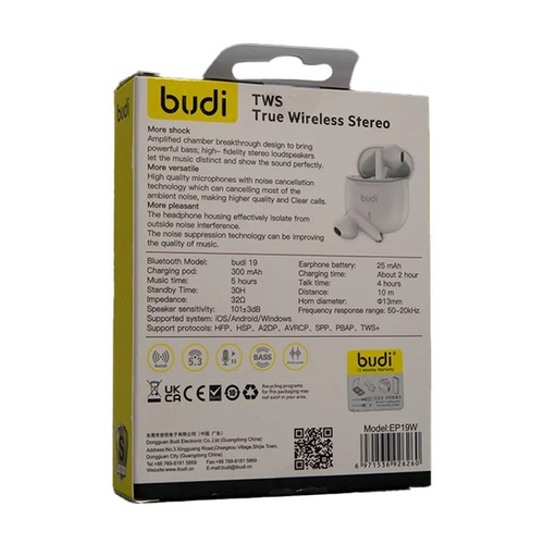 همین امروز هدفون Budi EP19W خود را تهیه کنید و از شنیدن موسیقی بدون نگرانی از تمام شدن شارژ لذت ببرید!